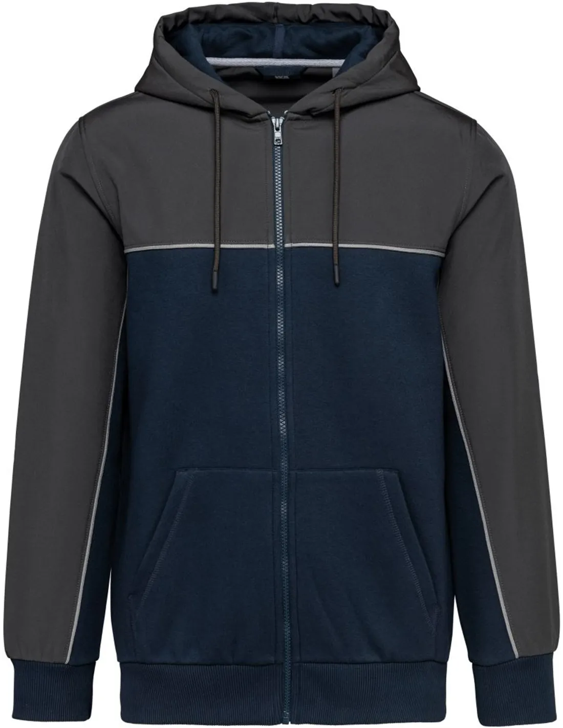 Ravni kroj, dvoslojna kapuca z vrvico, ovratni trak v obliki ribje kosti, polmesec na ovratniku, 2x2 rebrasti manšeti na rokavih in robu, 2 kenguru žepa, srebrni robovi na rokavih in spredaj, zanka za obešanje, elastični softshell vstavki na ramenih in rokavih, etiketa TearAway, Pralno na 40°, ni primerno za sušenje v sušilnem stroju, ne čistite kemično.