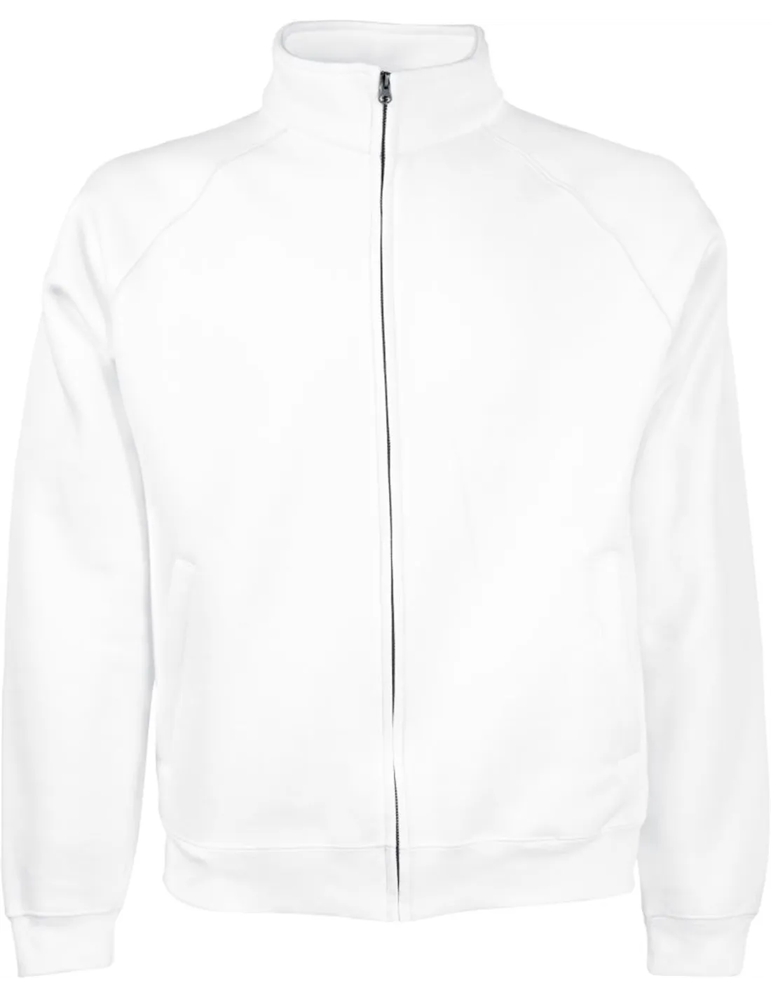 Stoječi ovratnik z enojnim ovratnim trakom iz džersija, raglan rokavi, rebrasto pletene manšete iz bombaža/elastana na rokavih in robu, skrita zadrga za boljše tiskanje, ozka zadrga po celi dolžini, 2 našitkana žepa.