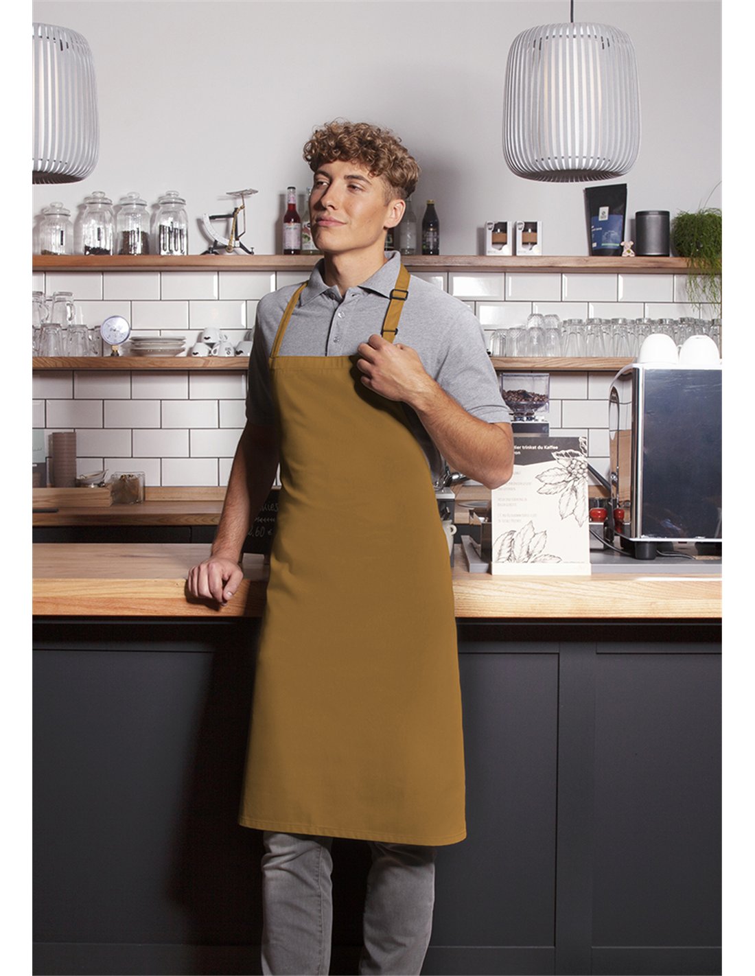 - bib apron with straps made of apron fabric, with reinforced stress points