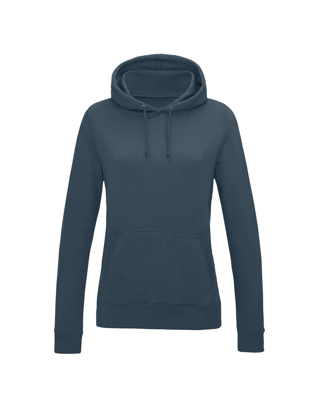 Ženski teliran model puloverja s kapuco, dva kenguru žepa spredaj. Na voljo v 25ih barvah