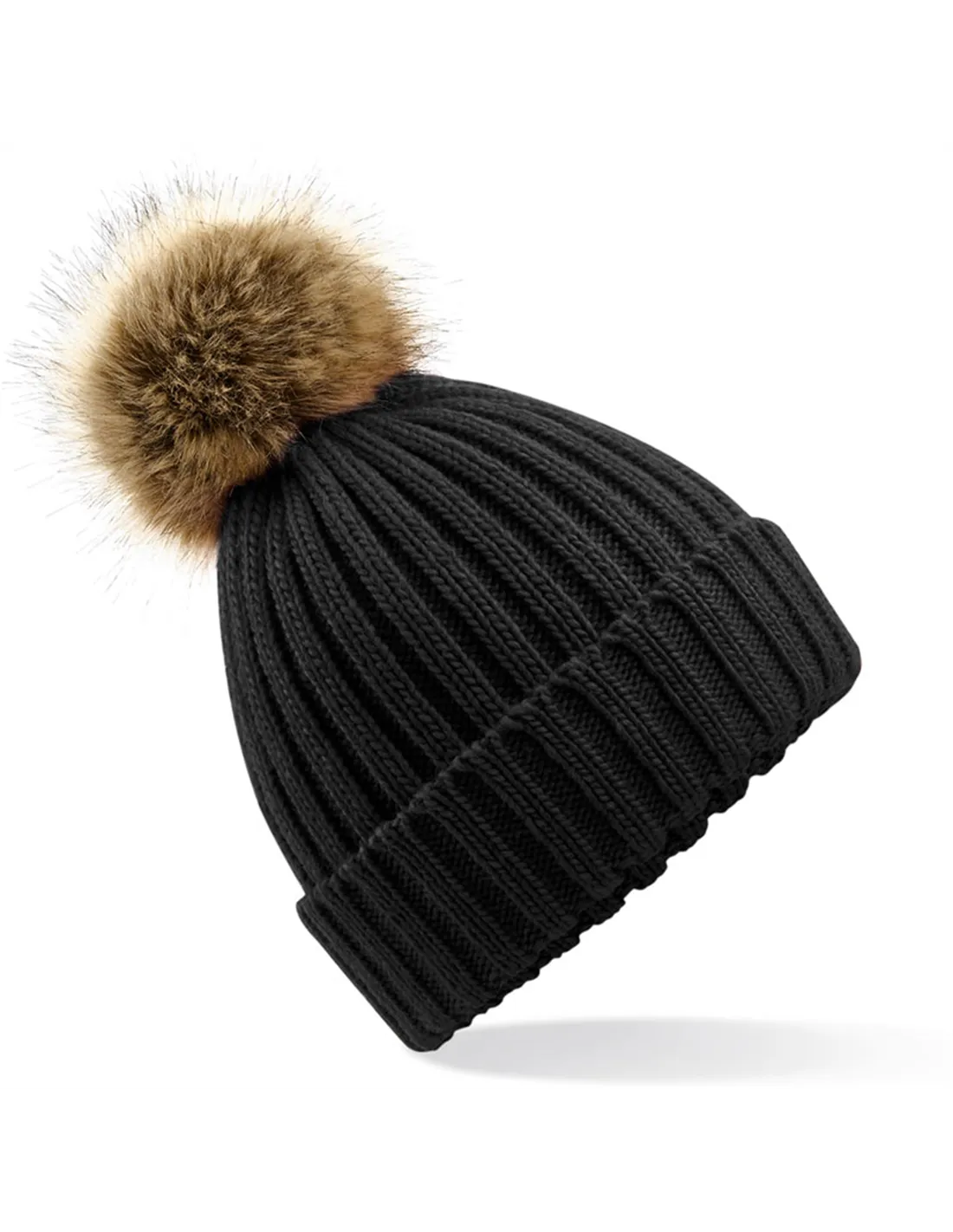 Dekorativna kapa iz umetnega krzna B413 ima odstranljiv, enobarvni cof. Izdelana iz razkošne rebraste pletenine.
